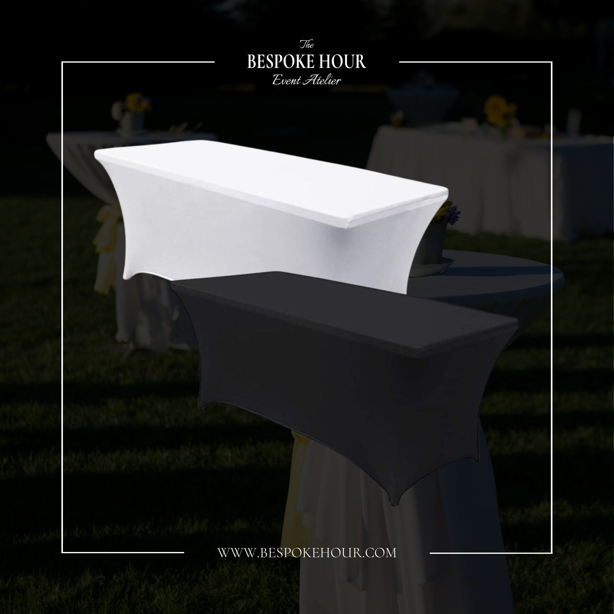 Практична кетъринг маса 180 с еластична покривка за изчистен и подреден вид. Подходяща за бюфети, събития и коктейли.