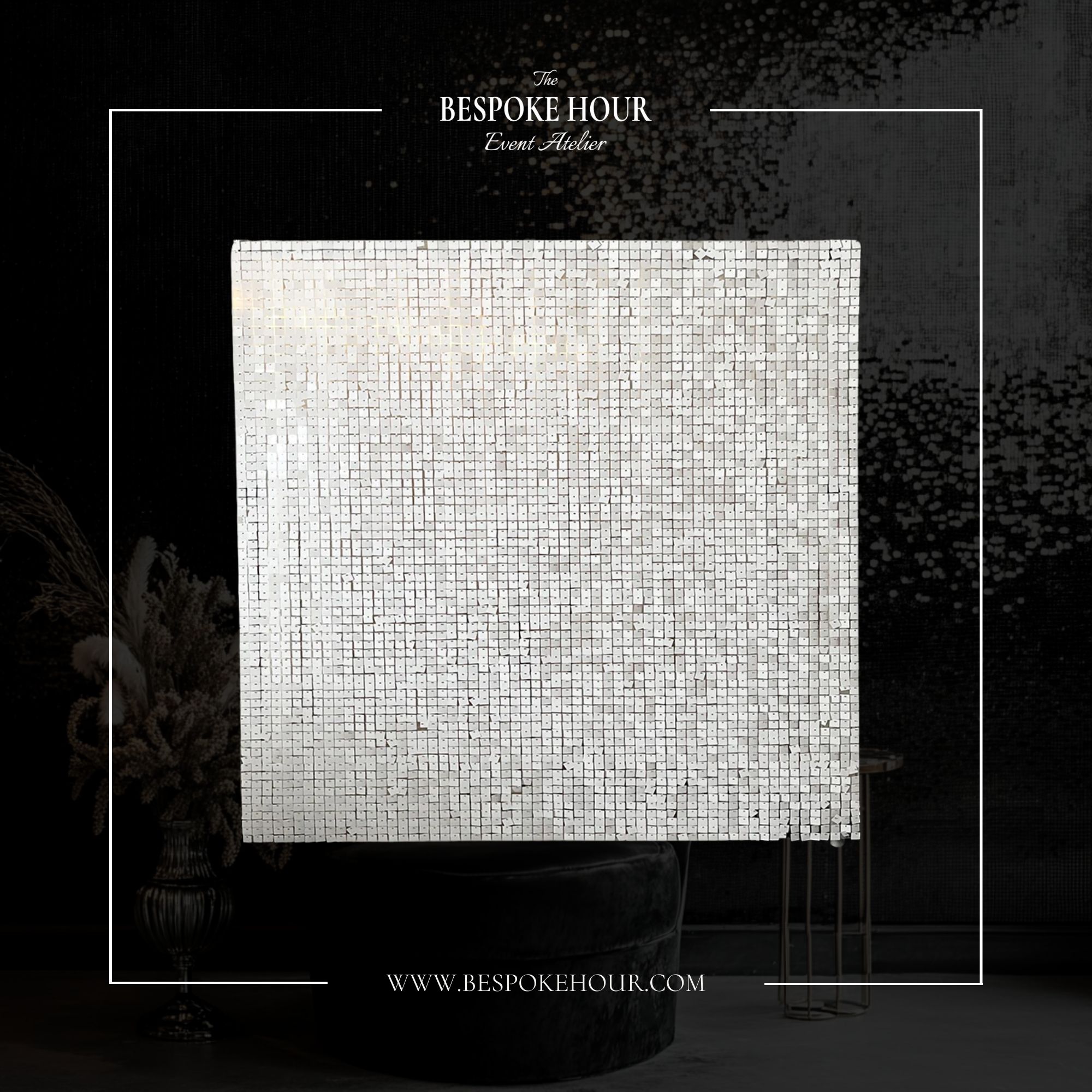 Нежна бяла пайетена стена, която отразява светлината красиво. Подходяща за сватби, кръщенета и изчистени декорации.