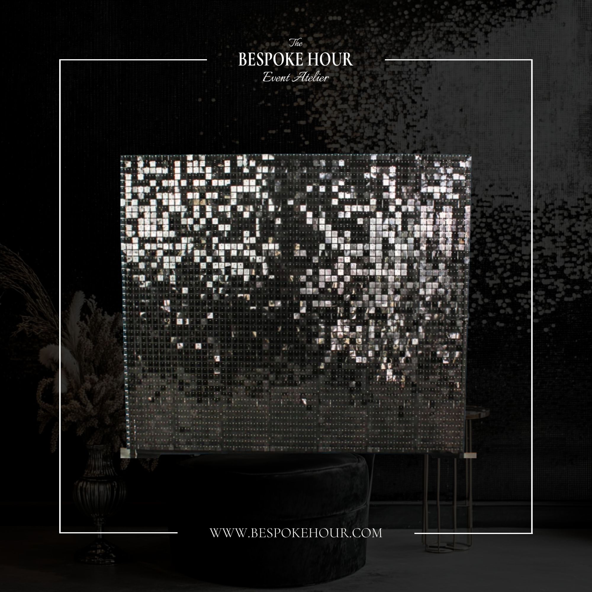 Стилна черна пайетена стена с дискретен блясък за елегантна атмосфера. Идеална за вечерни събития и луксозни декори.